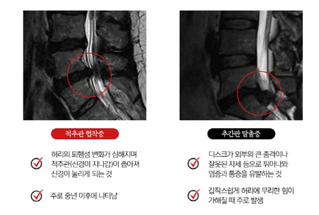 디스크는 척추뼈와 신경 사이의 디스크로 인한 손상 때문에 내부핵이 빠져나갈 수 있는 질병이다.척추 협착은 척수 운하로 인한 질병이다.협착의 경우 증상이 다시 구부러진 경우 증상이 더 심각하지만, 디스크 케이스의 움직임을 구부릴 때 통증이 심각하다.산책로 인한 차이가 있고, 부산 뒷통협착의 경우 다리 관절염수협착륙을 때 주저앉거나 앉거나 앉거나 앉으면 통증이 더 불편할 때 통증이 생길 때 주저앉아진다.