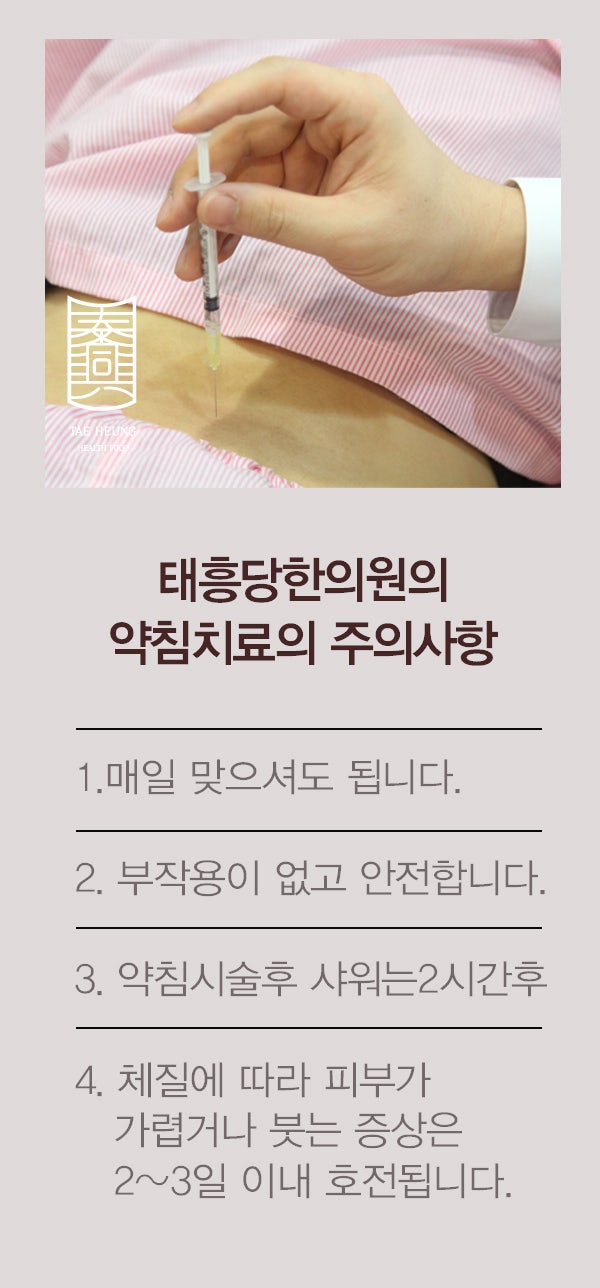 위나 대장 등 직접 주사하기 어려운 경우에도 위와 관련된 경혈 즉 병변에 정확하게 주사하기 때문에 신속하고 효과적으로 질병을 치료할 수 있다. 상황에 따라 자신의 체질에 맞는 약을 사용하여 치료효과를 극대화 할 수 있습니다. 이것은 염증 제거, 통증 완화, 면역 기능 조절 및 회복, 저항력 향상의 효과가 있습니다. 일반적으로 증상에 효과가 있는 의학적 침 치료를 시행하고 있어 증상에 따른 자세한 상담 후 맞춤형 의료 침 치료를 진행하고 있으니 내원하셔서 상담 및 치료를 받으시기 바랍니다! 면역 한약 침 사슴 약초 침술: 에너지 및 면역 회복, 근육/뼈 통증 치료 영지 한약 침술: 염좌로 인한 부종/통증 완화, 지방 용해 혈액 바늘: 염좌 및 부상으로 인한 사정 개선, 통증 완화, 노화 방지, 간기능개선 한약침 : 통증완화, 면역회복, 바이빙학회 지태흥당의원은 면역의학침패키지와 태반/벌약침패키지로 환자의 부담을 줄이고 건강한 일상을 찾을 수 있도록 노력하고 있습니다. 방문을 환영합니다 GMP 인증 의약품만을 사용하여 부작용 걱정없이! 사직태흥탕한의원의 한약은 인체에 무해한 GMP 인증 한약재에서 추출한 성분으로 만듭니다. 다른 주사치료의 부작용으로 자주 나타나는 현기증, 식은땀, 두통 등 지금까지 발견되지 않았던 부작용은 없을 것입니다. 일부 의료 침술 치료 후 환자가 느끼는 자극과 불편함은 하루나 이틀 후에 자연스럽게 사라지므로 걱정하지 마십시오. 약물침 치료는 환자의 나이와 체질 등 다양한 요인을 고려하여 개인에 맞는 치료용량과 치료부위를 선택하기 때문에 매일 여러 부위에 반복적인 수술을 하여도 부작용이나 문제가 없습니다. 한방치료 후 주의사항! 다른 부작용은 없으나 약간의 뻣뻣함이나 멍이 들 수 있습니다. 대부분 1~2일 이내에 호전되고 길어야 일주일 이내에 사라지므로 걱정하지 마시고 치료 다음날 한약침을 복용하시면 됩니다. 약간의 뻣뻣함이 있을 수 있습니다. (보통 1~2일 지나면 좋아짐) 2. 발열, 통증, 가려움증 등의 증상이 나타날 수 있으며 이때 냉찜질을 할 수 있습니다. 시술 부위에 멍이 생길 수 있으나 보통 7일 이내에 정상으로 돌아옵니다. 시술 후 3시간 후 샤워, 12시간 후 사우나. 조기 침 치료가 매우 중요합니다. 첫 주는 원래의 조직 상태를 회복하기 위해 매일 치료해야 합니다. (이후에는 주 2~3회 시술을 받는 것이 좋습니다.) 6. 약침과 병행하여 주 1~2회 고집하시면 침만 단독으로 하는 것보다 치료주기가 많이 단축됩니다. 사지태성탕한의원에서는 환자의 상태와 증상을 직접 파악한 후 약을 처방하기 때문에 부작용도 없고 치료도 빠르게 진행됩니다. 2층과 3층