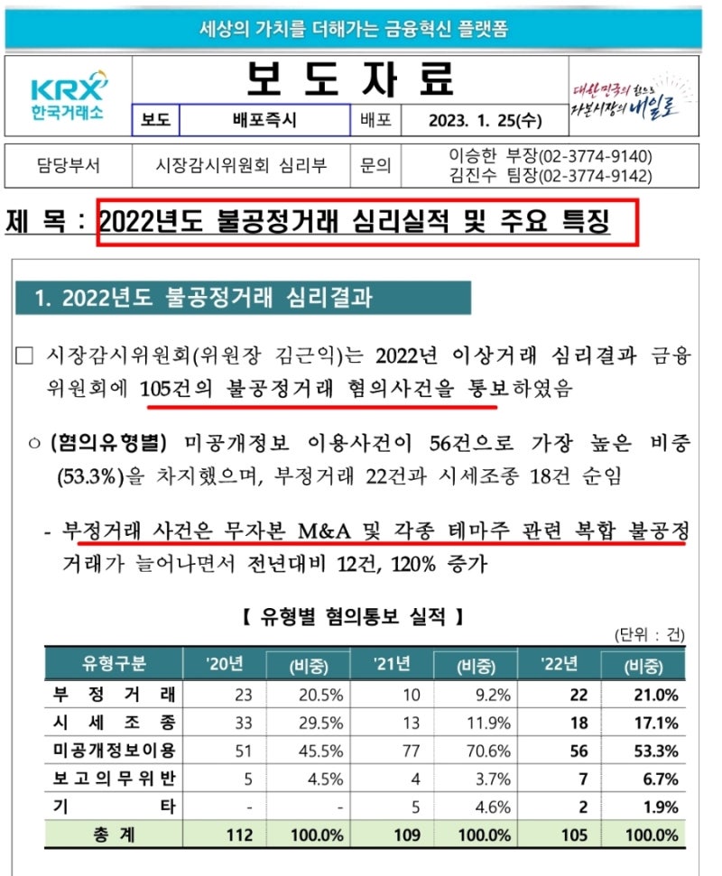 시장감시위원회는 2022년 불공정거래 심의 결과를 토대로 105건의 불공정거래 혐의를 금융위원회에 통보했다. 피의자 유형별로는 미공개정보 이용이 56건(53.3%)으로 가장 많았고, 사기거래가 22건, 시세조작이 18건 순이었다. 무자본 인수합병, 각종 대상주식 등 복잡·부당 거래가 늘었고, 사기 거래 건수는 전년 대비 12건 증가해 120% 증가했다. 【의심되는 알림 유형】(단위: 건)