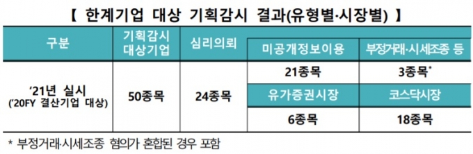 구분’20’21’22 (비중) (비중) (비중) 부정거래 2320.5% 109.2% 2221.0% 시급Ⅲ 3329.5% 1311.9% 1817.1% 미공개정보 이용 5145.5% 7770.6% 5653.3% 의무위반신고 54.7% 43.7% % % 76.7% 기타 – 54.6% 21.9% 합계 112100.0% 109100.0% 105100.0%