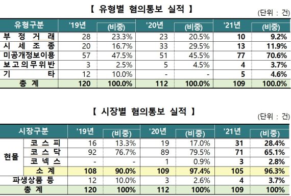 시장에서는 코스닥(78건, 74.3%) → 코스피(22건, 21.0%) → 코넥스(5건, 4.7%) 순으로 코스닥 주식시장이 집중돼 있다. 【각 시장별 신고 의심 실적】 (단위: 개)
